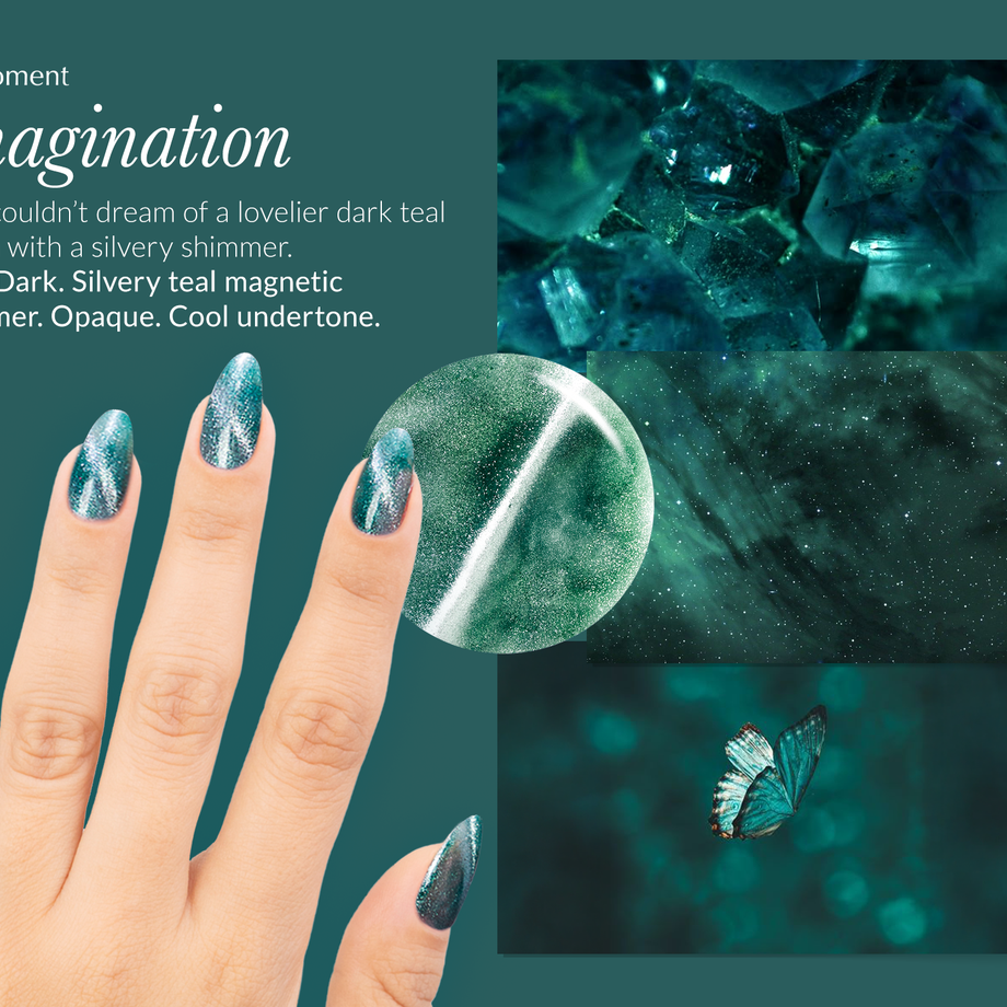 Teal. Dark. Silvery teal magnetic shimmer. Opaque. Cool undertone.